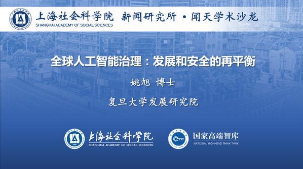2026年1月27日(周二)上午9:30,新闻所成功举办第27期闻天学术沙龙,特邀全球人工智能创新治理中心秘书长、复旦大学发展研究院副研究员姚旭博士担任主讲嘉宾,围绕“全球人工智能治理:发展和安全的再平衡”进行专题学术报告会。姚旭博士任上海数据研究院特聘研究员、上海市数字贸易协会理事等职务,曾在国家数据局借调工作,在人工智能全球治理、科技产业发展等领域研究成果丰硕。
